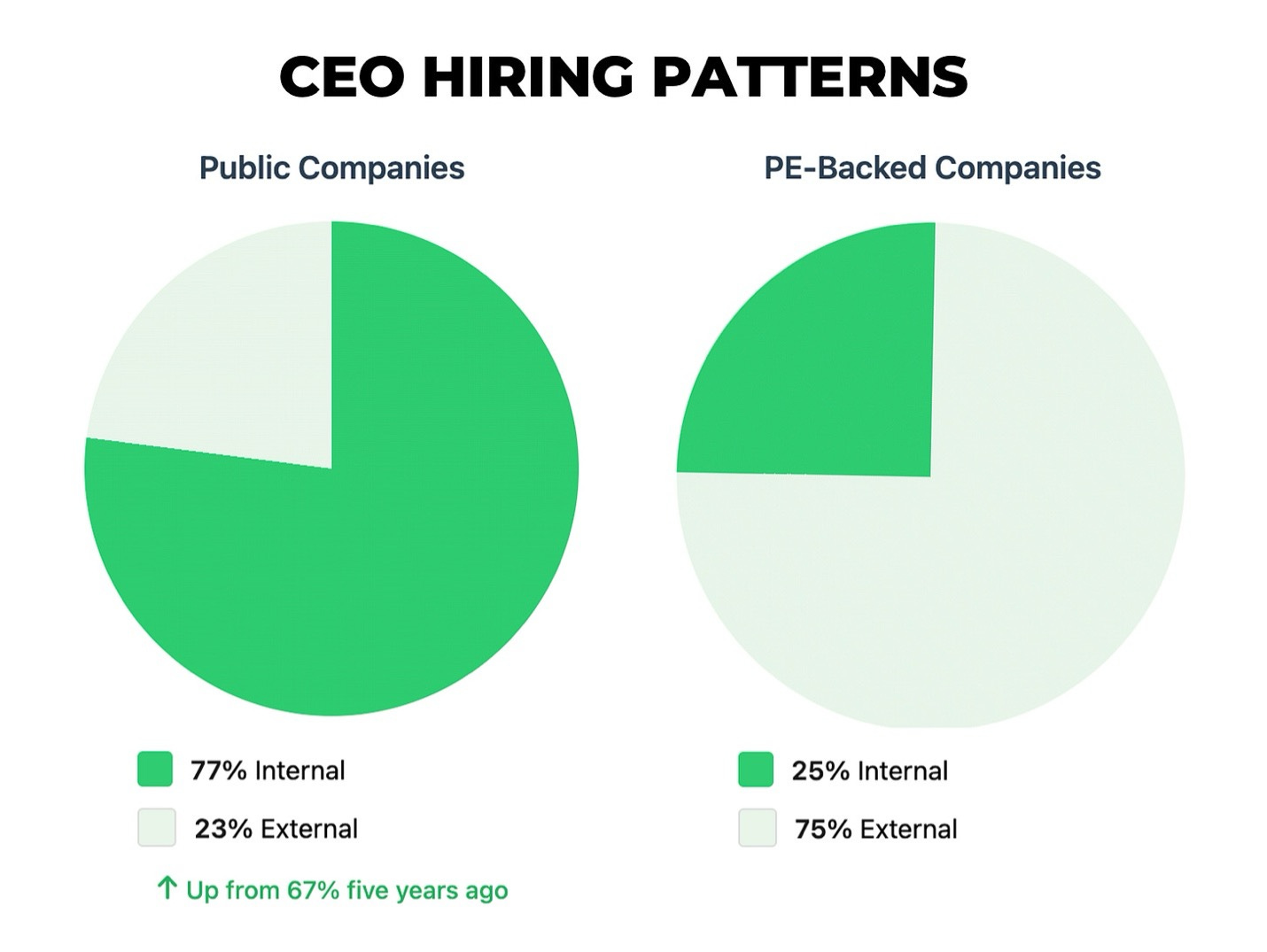 About 75% of new PE-backed CEOs are external hires. That’s a total flip on how public companies do CEO hiring; they opt for an internal candidate 77% of the time, up from 67% just five years ago.