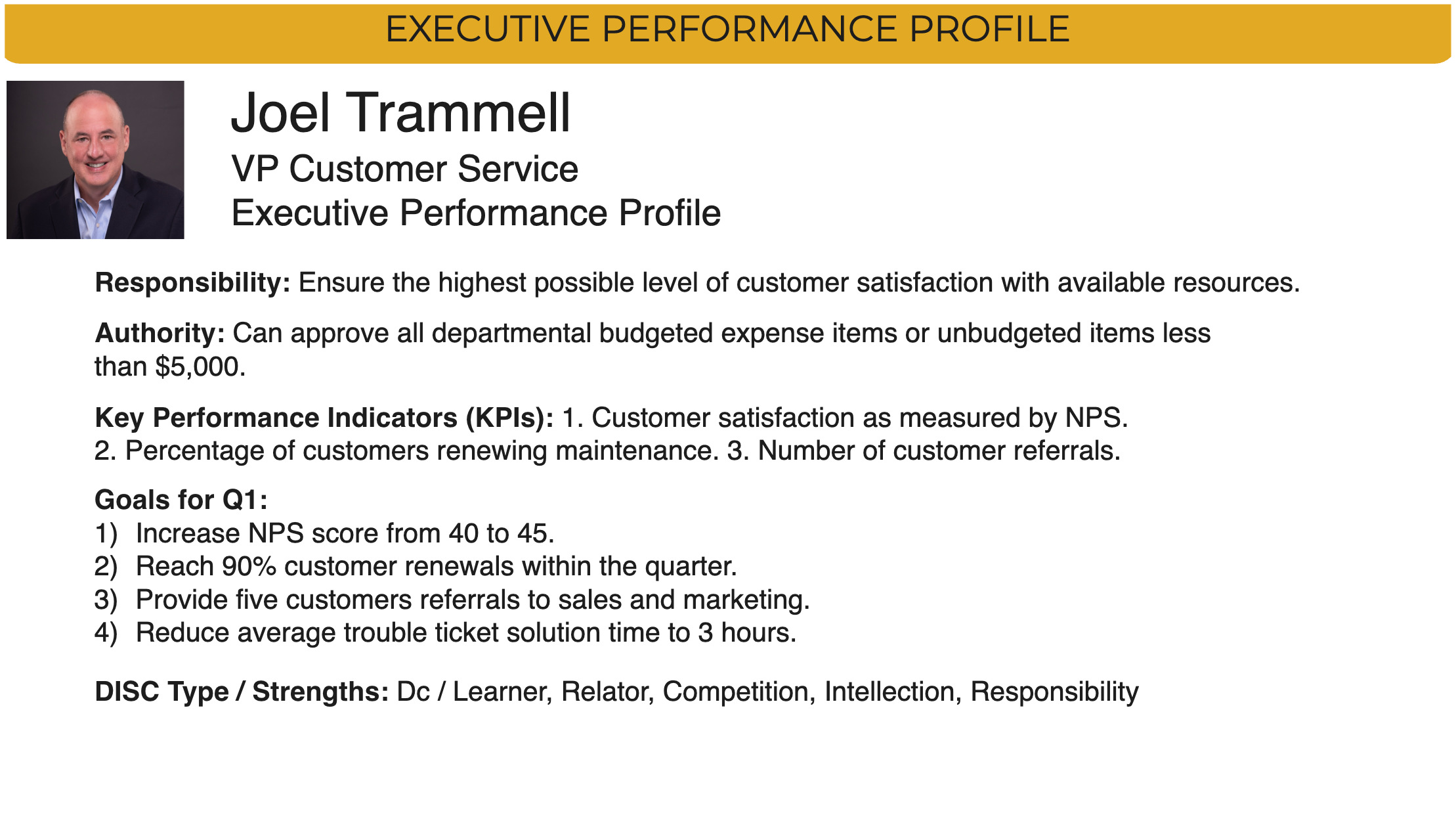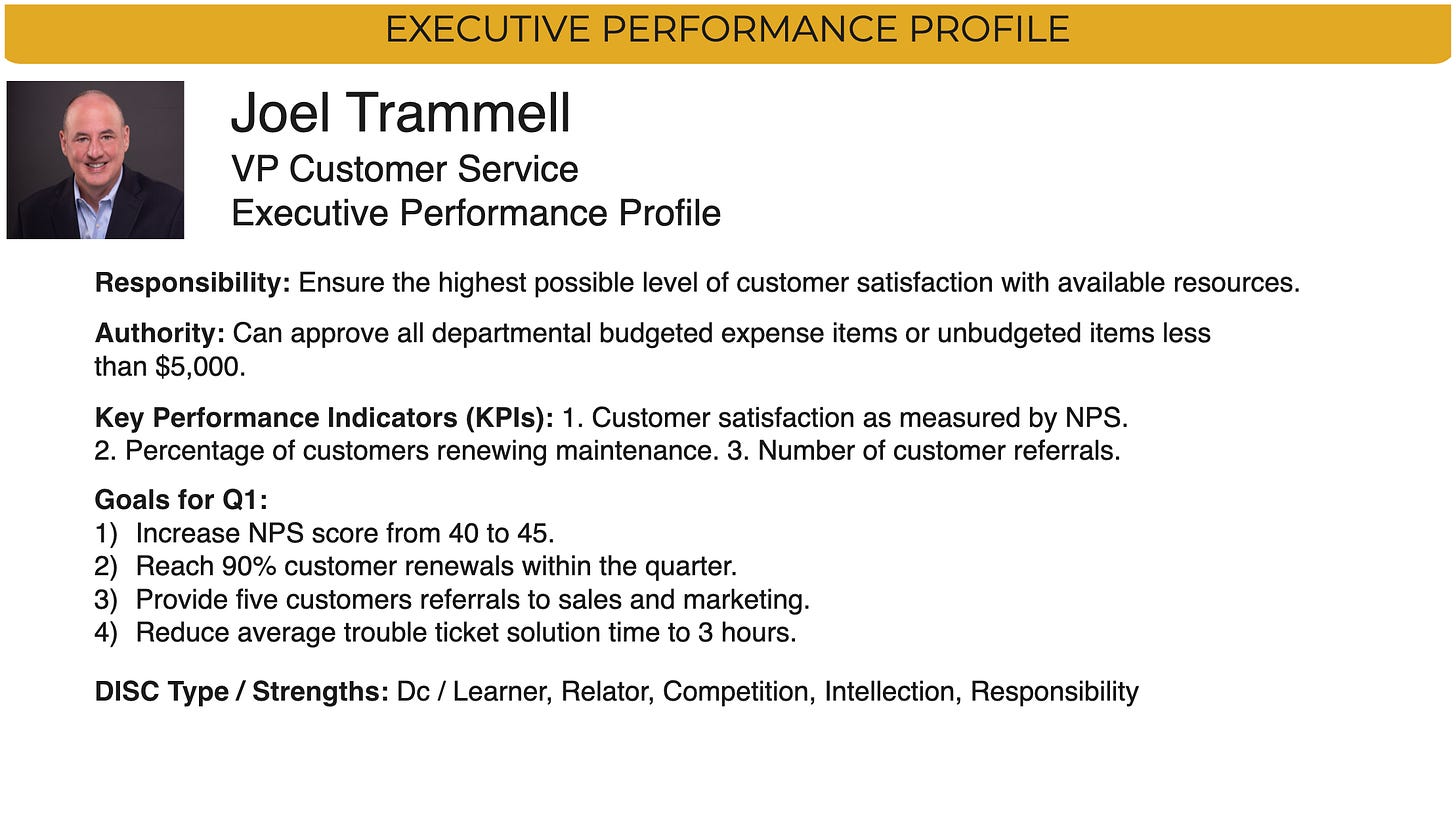 Now you’ve hired well and trained thoroughly. Ready to hold them accountable? Not quite. Now, you need to document their responsibilities and key metrics in what I call an Executive Performance Profile. This step, too, gets skipped or glossed over all the time, but it’s essential.