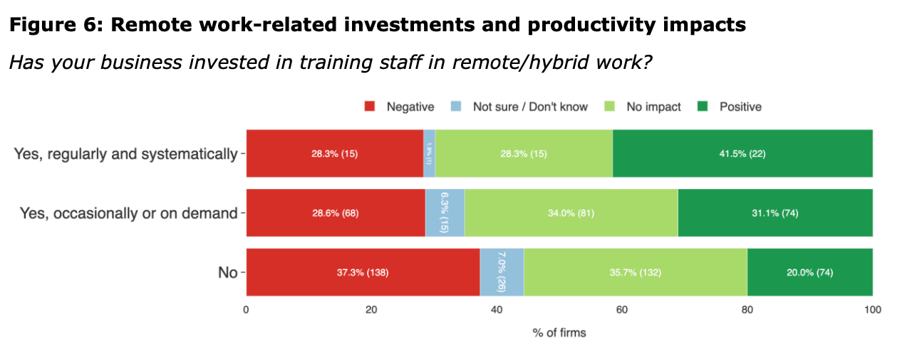 Training investment. Companies that trained staff systematically reported almost double the positive productivity outcomes from remote work compared to those with no training.